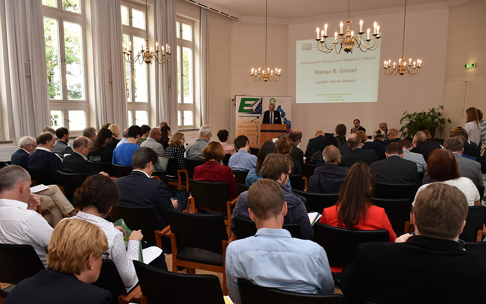 Rainer Wieland verleiht die Rainer B. Giesel die Europa-Union Medaille in Gold. Foto: Lutz Gude / JEF | Im Rahmen des Bundesausschusses wurde dessen langjähriger stellvertretende Vorsitzende Rainer B. Giesel mit der Europa-Union Medaille in Gold geehrt. Seit 1959 in der europäischen föderalistischen Bewegung aktiv, war er zunächst Vorsitzender des Europäisch-Föderalistischen Studentenverbandes Berlin, später Vorsitzender und schließlich Ehrenvorsitzender des Berliner Landesverbandes der Europa-Union. Auf europäischer Ebene ist er Sprecher der deutschen Delegierten in den Gremien der Union Europäischer Föderalisten. Auch in seiner politischen Arbeit spielte Europa eine besondere Rolle. So setzte er sich in seiner Zeit als Mitglied des Berliner Abgeordnetenhauses unter anderem dafür ein, dass die Kompetenzen des Ausschusses für Bundesangelegenheit um das Aufgabengebiet Europa erweitert wurden. Die Laudatio hielt EUD-Präsident Rainer Wieland. |