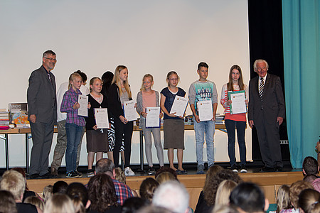 Aus insgesamt qualitativ guten Arbeiten der verschiedenen Gestaltungsarten ermittelte die Landesjury 152 1. Landespreisträger, die vom Bildungsministerium zu der vom Landesverband der Europa-Union Rheinland-Pfalz organisierten zentralen Tagesveranstaltung nach Saarburg eingeladen waren. In der mittelalterlichen Stadt wurden rund 240 Preisträger, begleitende Lehrkräfte und Angehörige von Stadt- und Verbandsbürgermeister Dixius nicht nur willkommen geheißen, sondern auch gleich in die folgende, sinnvoll vorbereitete Stadtrallye eingeführt, ein gut angenommenes Novum im jährlichen Veranstaltungsreigen. Nach kräftiger Stärkung in der Mensa des Gymnasiums, dessen Schulorchester die folgende Feierstunde musikalisch umrahmte, verband Landeswettbewerbsleiter Beygo den Wettbewerb mit europapolitischen Ereignissen und Ministerialrat Dr. Sundermann vom Bildungsministerium mit der örtlichen Geschichte. Spannender Höhepunkt war natürlich die Preisübergabe. Manfred Däuwel lud zur neuen 64. Wettbewerbsrunde unter dem Motto „In Vielfalt geeint – Europa zwischen Tradition und Moderne“ ein und brachte sie in Zusammenhang mit Europas jüngster Geschichte.