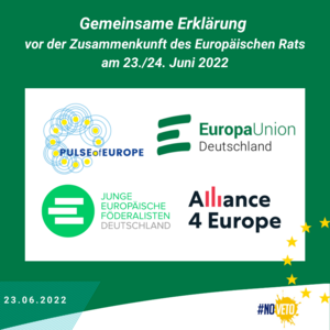 Gemeinsame Erklärung von Pulse of Europe, Europa-Union Deutschland, Jungen Europäischen Föderalisten Deutschland und Alliance4Europe vor der Zusammenkunft des Europäischen Rats am 23./24. Juni 2022