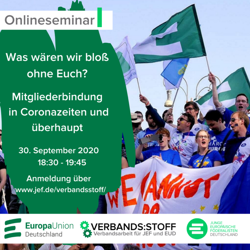Mitglieder sind das A und O unseres Verbandes. Ohne Mitglieder kein Ehrenamt, kein Geld, keine Aktivitäten – kurz keine Europa-Union und keine JEF. Damit es dazu nicht kommt und wir im Gegenteil künftig mehr und noch zufriedenere Mitglieder haben, lohnt es sich, unsere Mitgliederarbeit genauer unter die Lupe zu nehmen. Bei dieser Ausgabe der JEF-EUD-Akademie beschäftigen wir uns daher mit folgenden Fragen: Wie werden aus normalen Mitgliedern engagierte Aktive und Botschafter für unsere gemeinsame Sache? Wie gelingt uns eine engere persönliche Bindung unserer Mitglieder an den Verein? Wie können wir unsere Mitglieder beteiligen, fördern und ihre Potenziale erkennen? Welche besonderen Angebote können wir unseren Mitgliedern insbesondere jetzt in der Corona-Zeit vor Ort machen?