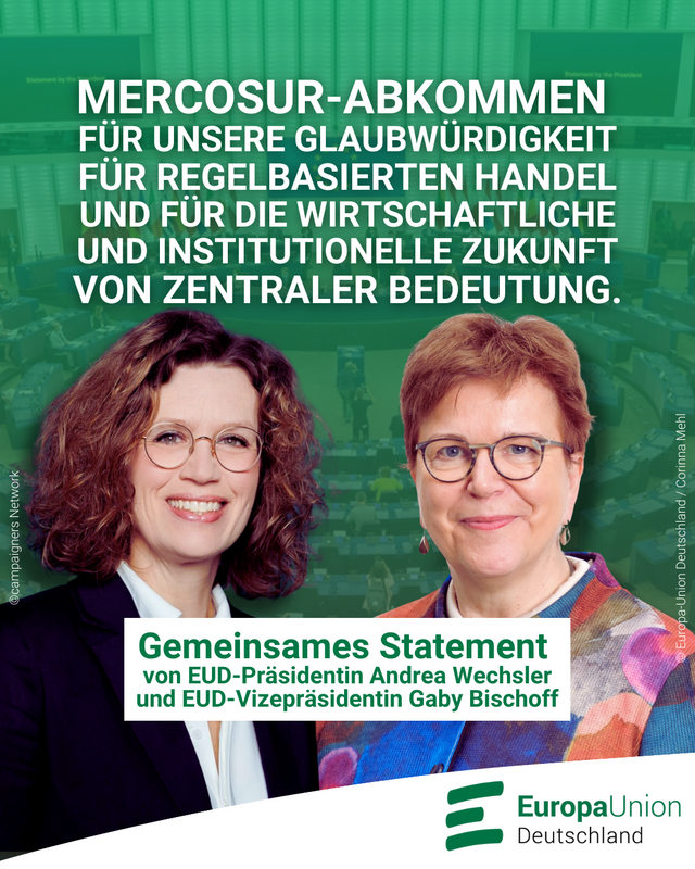 Das Europäische Parlament hat heute einen Aufschub der Ratifizierung des EU-Mercosur-Abkommens herbeigeführt. Die Präsidentin der überparteilichen Europa-Union Deutschland, Andrea Wechsler, und die Vizepräsidentin Gaby Bischoff, beide Mitglieder des Europäischen Parlaments, haben gegen diese Entschließungen gestimmt.